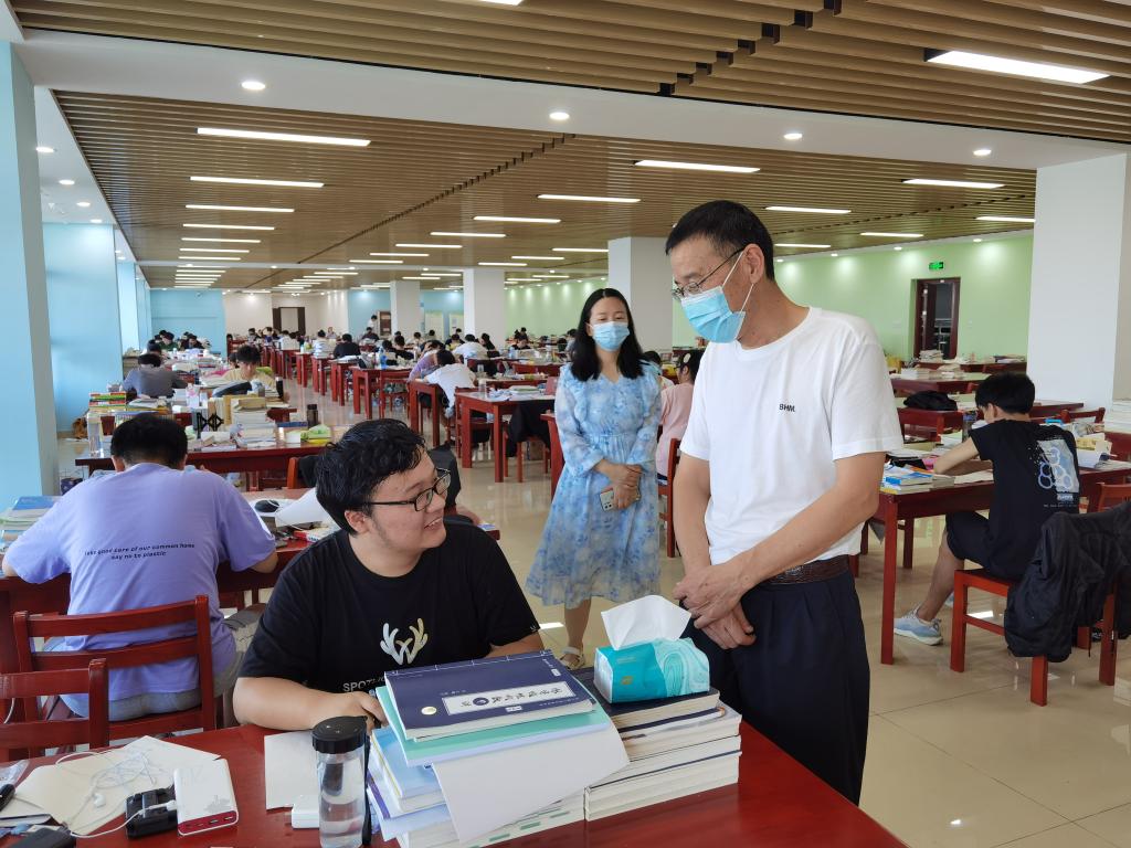 骆海邦在图书馆轻声与学生交流,问询考研学生报考院校、复习进度、寝室住宿、进出校门制度等学习生活情况。随后,骆海邦一行又前往学生宿舍,看望即将离校返家的学生,问询学生在校感受、学习状态、学校暑期生活情况等。同学们认真回答了关于报考院校、复习进度等问题,并普遍反馈暑期图书馆的开放给他们提供了很大便利,电信192班周宏说到,“很多高中同学的就读院校,暑期并没有允许学生留校,感觉我们安科还是很人性化的,给我们提供了良好的考研备考环境。”