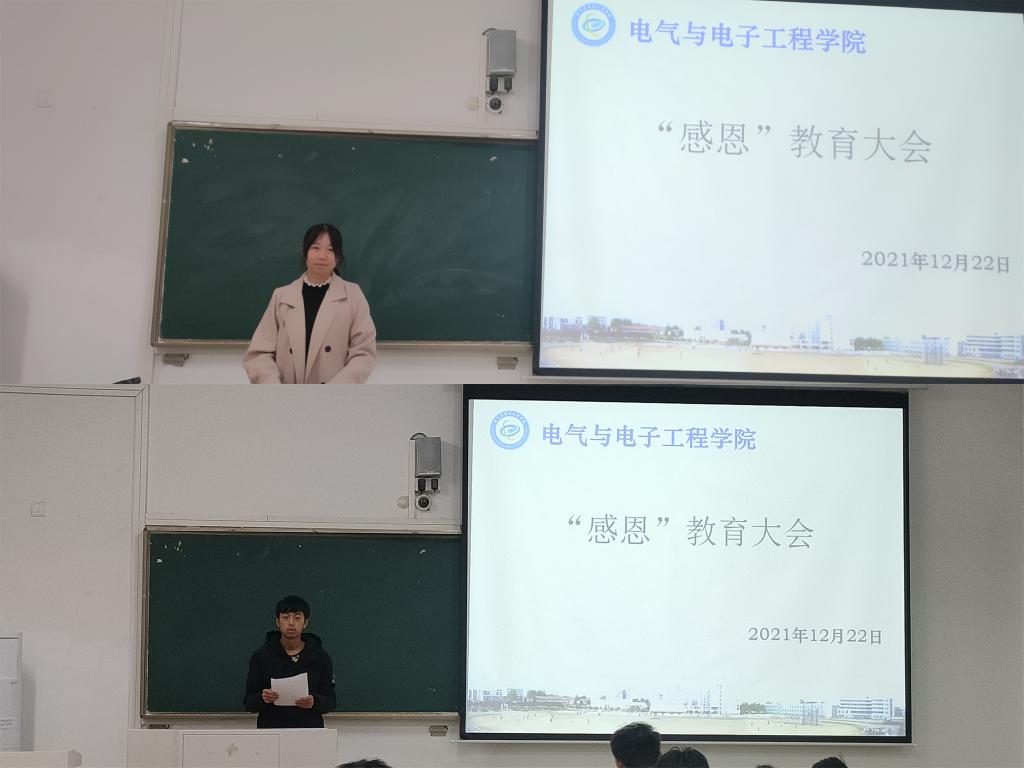 为提高学院学生的“感恩”意识,同时引导学生树立正确的价值观。12月22日晚,电气与电子工程学院于龙湖校区致知楼C108举办了“感恩”教育大会。辅导员张深,学院国家励志奖学金及国家助学金获得者代表共同参加此次大会。