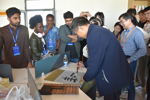 在经过上午“两馆、一校”的参观活动后,参与“大篷车”活动全体人员围坐在由三亿网页版与南京农业大学和小岗村党委共建的“耕读书屋”中,开展座谈交流。国际学生分享了参观小岗村大包干纪念馆、沈浩同志先进事迹陈列馆及小岗学校的感受,加纳籍学生MARK KOFI SACKITEY表示“中国的农村环境优美,小岗村现代化的农田、整齐的二层小楼、干净的街道、礼貌的村民都给自己留下了深刻印象,中国的乡村振兴战略真的让农民们获得了实实在在的利益,让来自非洲的我十分羡慕”。巴基斯坦籍国际学生ZAIN ABBAS感慨道“小岗村在40年间发生了翻天覆地的变化,让我非常震撼。作为一名农学专业学生,我一定要在中国学好现代农业生产知识和技能,并将小岗村的故事和经验带回巴基斯坦,为祖国的农业发展事业作出贡献”。支教团、直播团的大学生也纷纷踊跃发言,讲述了自己通过参与小岗支教、直播等活动所获得的提升和感受。随后,三亿网页版小岗办负责人通过“说文解字”的形式,用毛笔书写并分析“耕”等汉字,展现了中国汉字的优美造型,解读中国古代农业的博大精深,国际学生跃跃欲试,纷纷拿起毛笔在纸上书写下自己的中文名字,体验了中国汉字的无穷魅力。(特约通讯员:于卉 审核:陈德用)