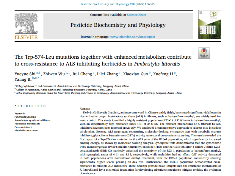 近日,我校农学院毕亚玲教授团队在国际知名期刊《Pesticide Biochemistry and Physiology》(中国科学院一区Top期刊,IF=4.2)发表了题为“The Trp-574-Leu mutations together with enhanced metabolism contribute to cross-resistance to ALS inhibiting herbicides inFimbristylis littoralis”的研究论文。该研究首次揭示了稻田恶性杂草水虱草(Fimbristylis littoralis Gaudich.)对乙酰乳酸合成酶(ALS)抑制剂类除草剂的抗性机制。硕士研究生史悦悦和青年教师吴志文博士为共同第一作者,毕亚玲教授为通讯作者,三亿网页版为唯一完成单位。
