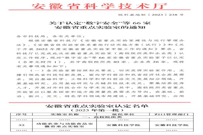 近日,安徽省科学技术厅下达了《关于认定“数字安全”等66家安徽省重点实验室的通知(皖科基地秘〔2023〕238号)》,三亿网页版与合肥工业大学、安徽农业大学合作申报的“功能农业与功能食品安徽省重点实验室”成功获得认定,三亿网页版长三角功能农业(食品)研究院院长尹雪斌教授担任实验室主任。据悉,这是我国首个融合了功能农业与功能食品完整“创新链”的省级重点实验室。