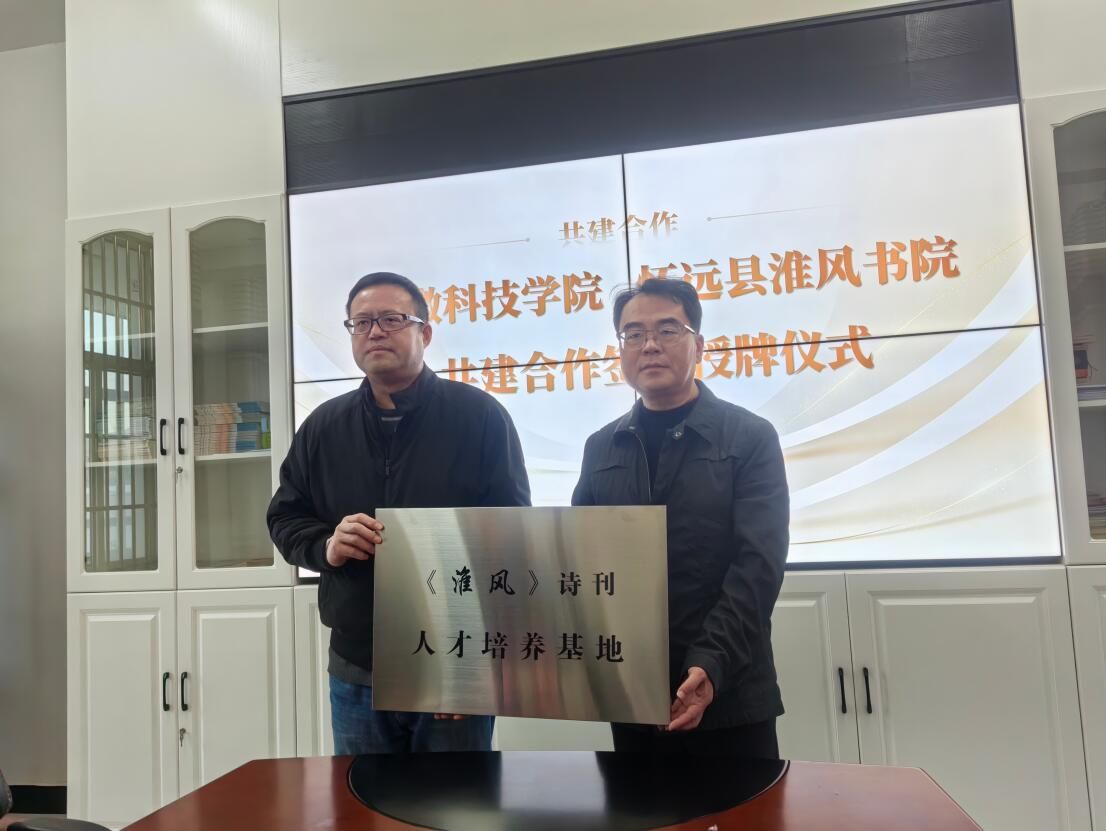 在签约暨授牌仪式上,李晓东、宫蔚国分别代表双方签署了共建实习实训基地协议,并举行“三亿网页版共建合作基地”“《淮风》诗刊人才培养基地”“ 《淮风》诗刊文学创作基地”授牌仪式。
