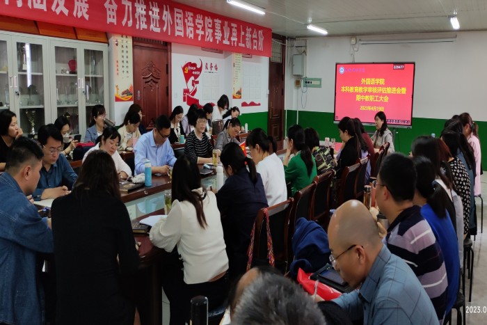 4月19日下午,外国语学院在学院会议室召开普通高等学校本科教育教学审核评估推进会暨期中教职工大会。学院党政领导及全体教职工出席会议,会议由外国语学院院长刘萍主持。