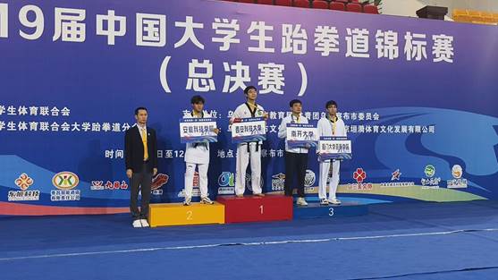 我校跆拳道队经过南方赛区奋战,获得三个参赛名额。此次总决赛由于江宏老师担任教练。经过为期5天的激烈角逐,运动健儿们顽强拼搏,获得男子甲组团体总分第七名,唐硕(管理学院)获得男子甲组-87KG银牌和“优秀运动员”称号,崔甲贝(化学与材料工程学院)获得男子-80KG级铜牌,褚海玥(信息与网络工程学院)获三等奖。