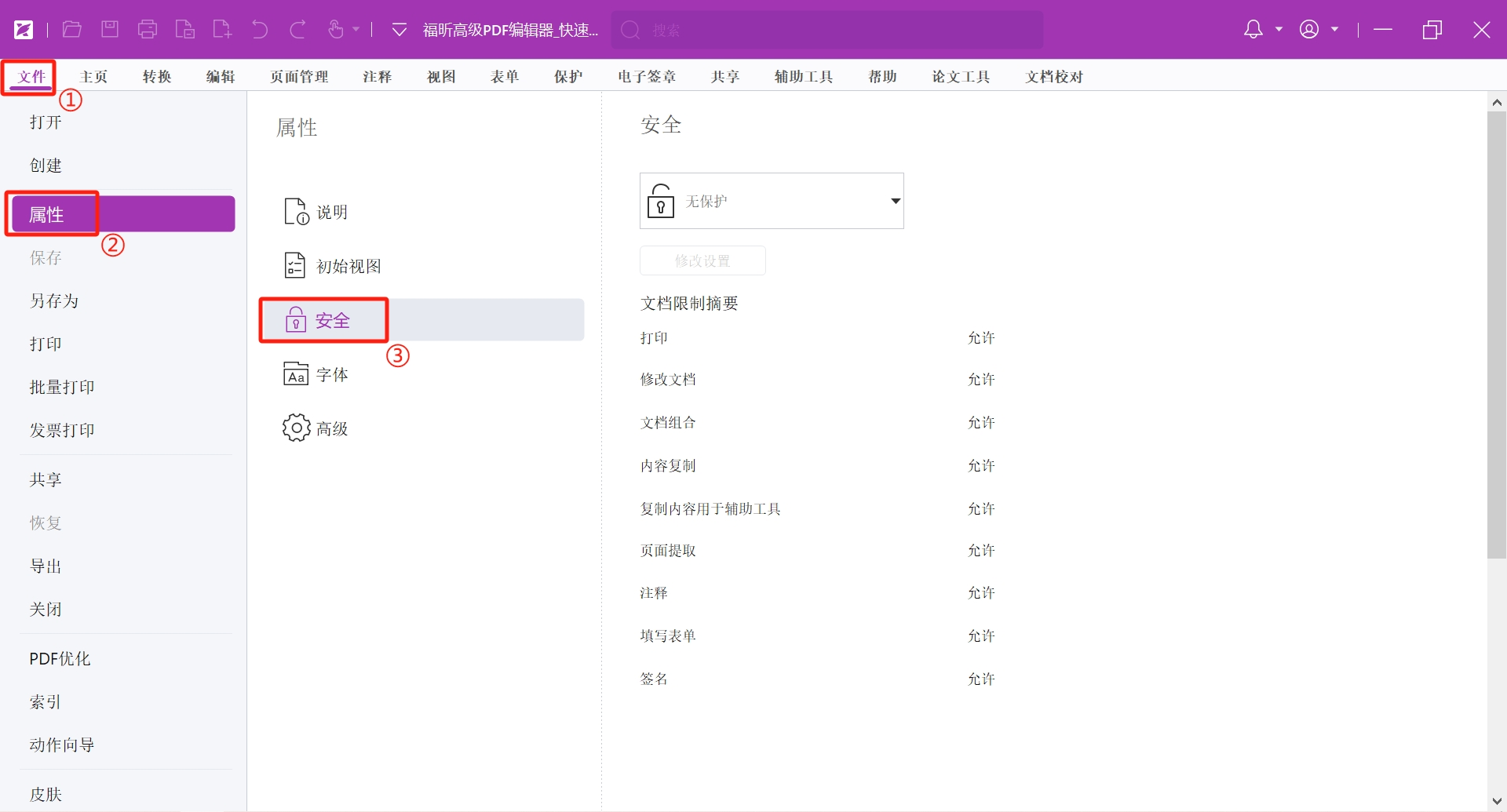 我们利用福昕高级PDF编辑器打开一份文档,点击左上角【文件】>【属性】>【安全】,这时就可以在右侧看到权限情况。如下图,该文档是无密码保护的。