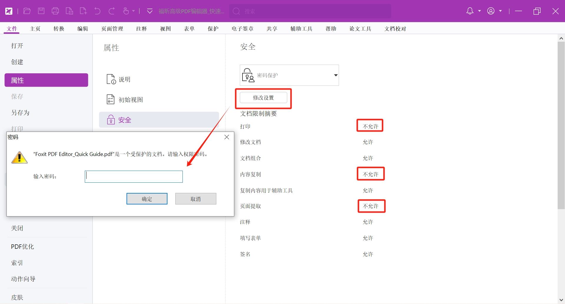 如以下文档有【密码保护】,显示不允许打印、内容复制等;此时如果我们需要对其进行打印,则需要输入正确的密码,并将权限修改成允许打印才可以进行打印。