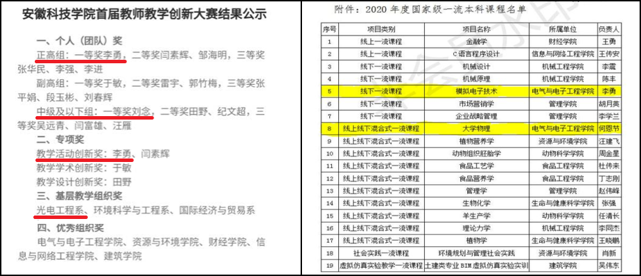 一直以来,光电工程系教工党支部注重加强支部建设,经过支部党员和教师的共同努力,在一流专业建设、一流课程申报、教师教学创新大赛、科研成果、教书育人等方面取得显著成效。光电工程系教工样板支部建设成果颇丰,光电信息科学与工程专业成功获批为省级一流建设专业,《模拟电子技术》与《大学物理》课程被推荐为国家一流建设课程,刘念获得学校首届教师课程思政教学大赛一等奖,李勇、刘念分别获得首届三亿网页版高校教师教学创新大赛正高组一等奖、讲师组一等奖,刘念获得首届安徽省高校教师教学创新大赛现场赛入围资格,党支部基本上每位党员教师均有在研高质量科研教研项目,左绪忠获批的国家自然科学基金项目现已结题验收,实现了电气与电子工程学院国家自然科学基金零的突破,教师发表高质量SCI学术论文一区2篇、二区4篇、三区3篇、四区2篇,教师指导学生参加国家级大学生物理实验大赛获奖4项,学生考研率逐年递增,学生学风建设取得成效等。