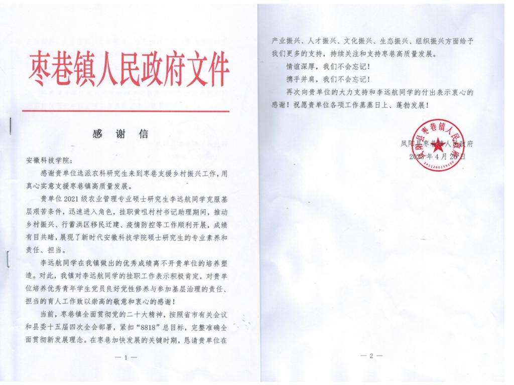 近日,一封来自凤阳县枣巷镇人民政府的感谢信寄到了我校,信中对管理学院2021级农业管理专业硕士研究生李远航同学提出了表扬。