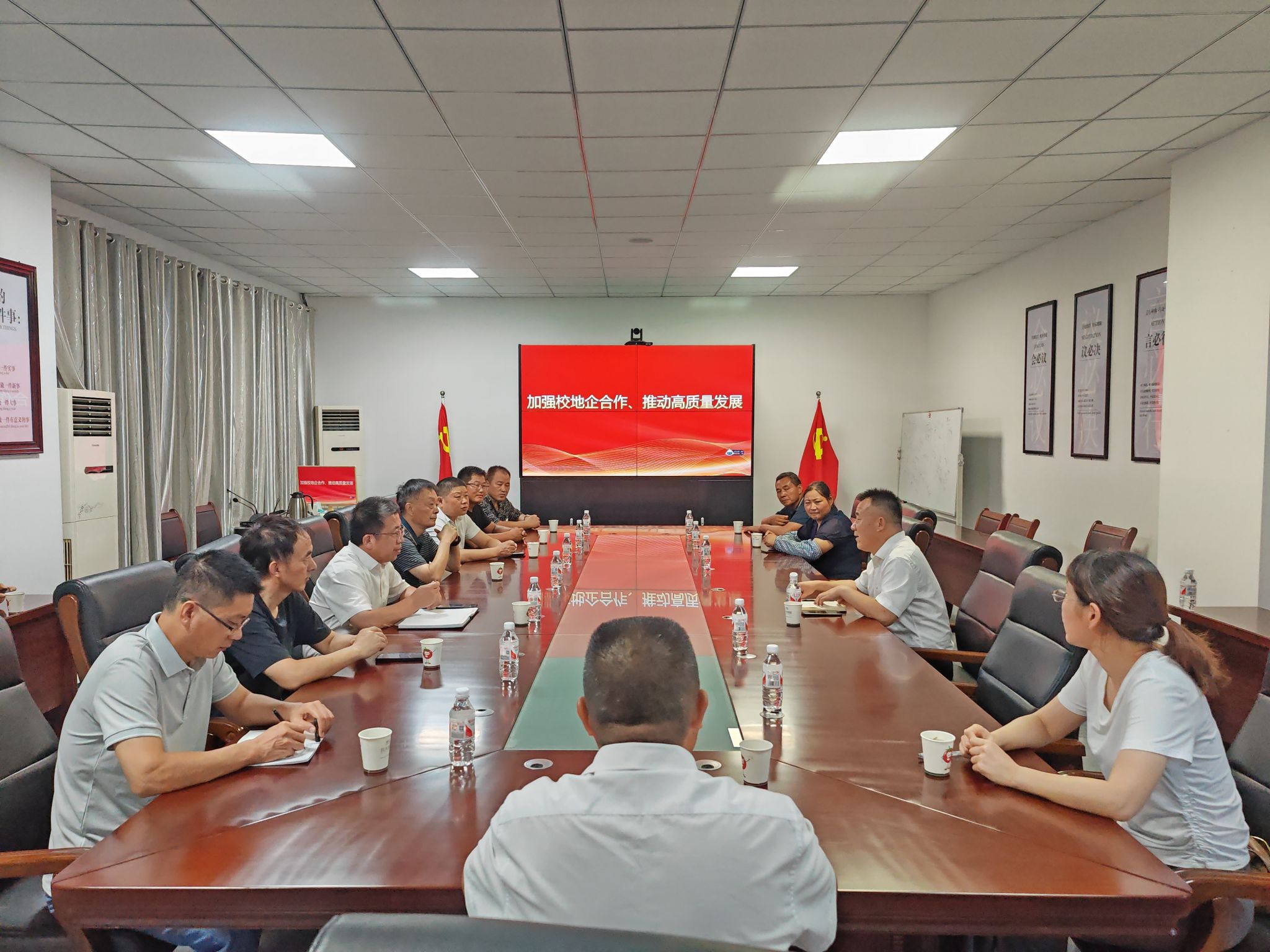 校政企三方在瓦大会议室举行座谈会,座谈会由瓦大总经理刘志才主持。刘志才对客人的到来表示欢迎,并详细介绍了公司的发展历程、主责主业、发展方向、拓展理念及鲜食番茄高端市场销售渠道等具体情况,表示愿意创造条件与霍邱县及众企业合作,共同发展。崔广荣简要介绍了此次瓦大行主要目的,并对双方合作提出要求和建议;何克勤介绍了特派团具体工作开展情况;何世潮简要回顾了农学院和瓦大之间的合作和所取得的成果,对科技特派团的工作表示肯定,对霍邱县科技局的主动作为和精心组织表示赞赏,对瓦大的热情接待和刘志才的详细介绍表示感谢;何世潮还简要介绍了学校办学历史、毕业生特点和本届毕业生在瓦大求职等相关情况。四家到访家企业详细介绍了各自的发展规模和合作意向;王鹏代表科技局表示全力支持霍邱企业与瓦大的合作,并叮嘱企业多向瓦大学习,尤其是新品种开发和新营销手段,以促进乡村特色产业发展壮大,助力农民发家致富。座谈会上校政企三方就西红柿种植管理和合作等方面开展了深入探讨,并就未来合作达成了初步意向。