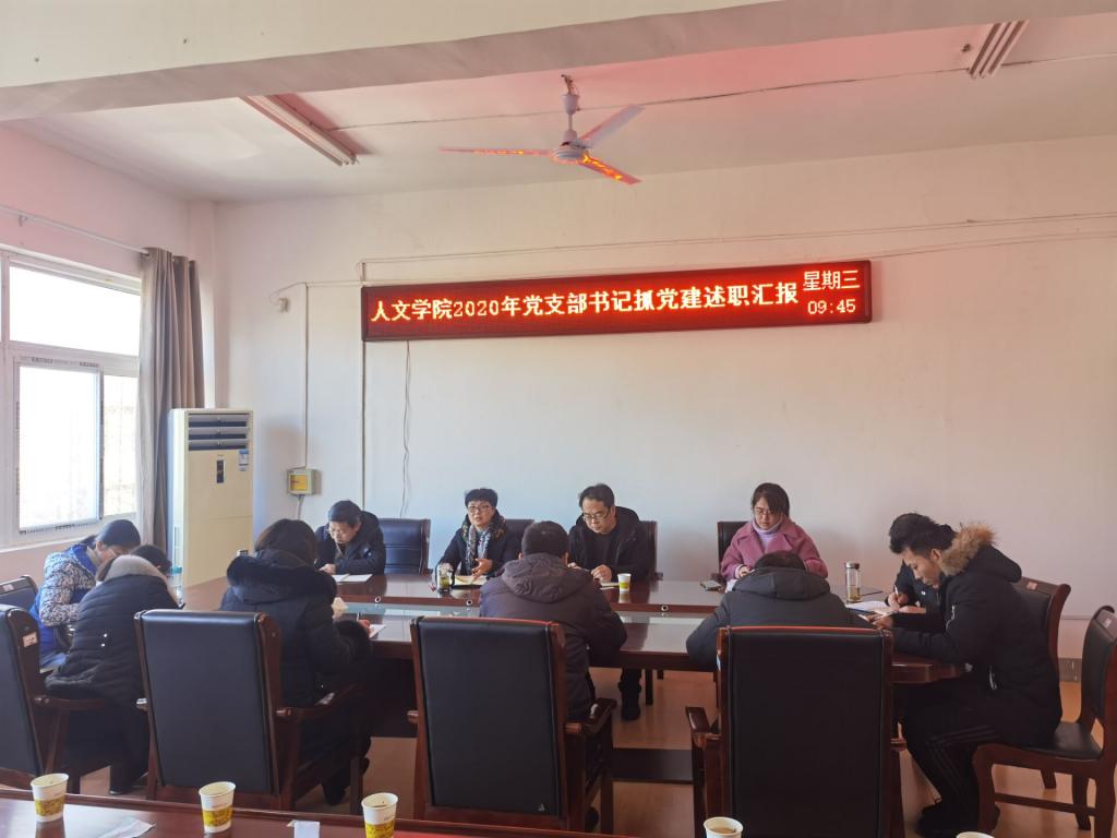 为深入学习贯彻习近平新时代中国特色社会主义思想,落实党的十九大和十九届四中、五中全会精神,坚决落实党风廉政建设各项工作要求,坚持党要管党、全面从严治党。根据《中共三亿网页版委员会关于开展2020年度基层党组织书记抓党建述职评议考核工作的通知》文件要求,人文学院于1月13日上午在学院会议室召开2020年度基层党支部书记抓党建述职评议会。学院党总支委员、党支部委员、工会主席、民主党派和无党派教师代表以及学生党员代表参加。会议由党总支书记杜士凤主持。