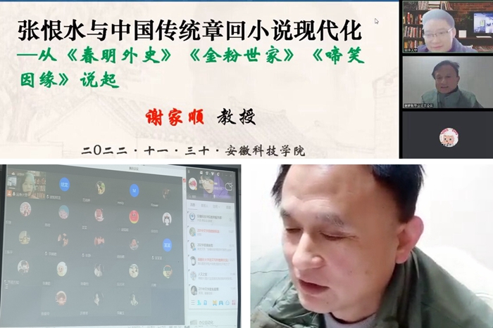 2022年11月30日下午,池州学院文学与传媒学院谢家顺教授应邀为人文学院中文系师生作学术报告:“张恨水与中国传统章回小说现代化——从《春明外史》《金粉世家》《啼笑因缘》说起”。报告会由人文学院副院长牛永辉主持。
