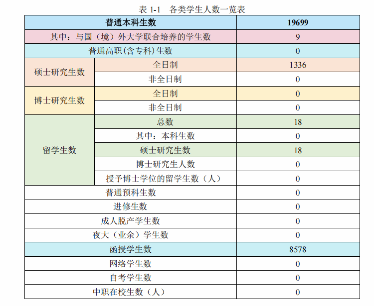 学校有全日制本科生 19699 人,硕士研究生 1336 人,外国留学生(硕士研究生)18 人,本科生数占全日制在校生总数的比例为 93.57%(见表 1-1